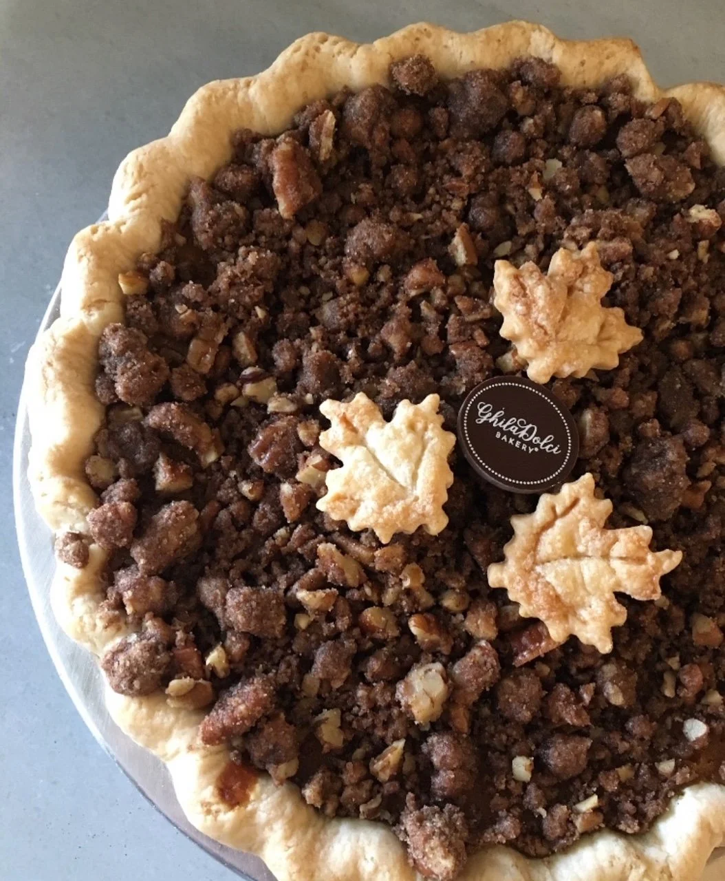 Pumpkin pie with a cinnamon-brown sugar crumble topping (no nuts). $40